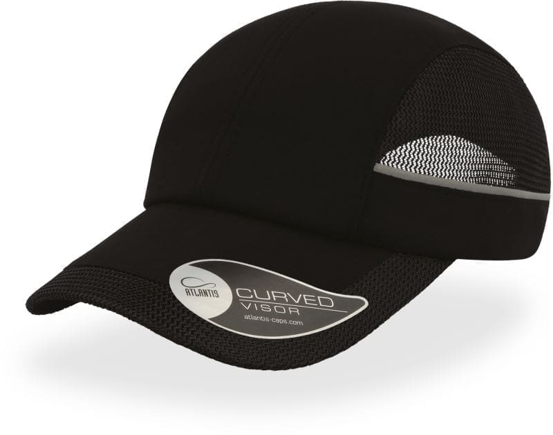 Aufkleber auf dem Schirm, gebogener Schirm, Mesheinsätze seitlich und auf dem Schirm, Schweißband aus Polyester, Stoffband mit Metallverschluss, reflektierende Details (ohne Schutzfunktion), TearAway Label, Handwäsche, nicht bügeln, nicht trocknergeeignet, nicht chemisch reinigen