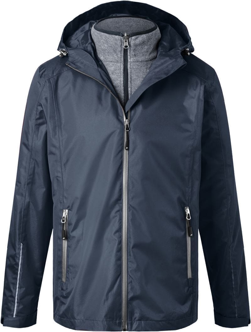 Außenjacke: wind- und wasserdicht (5.000mm Wassersäule), wasserdichte Reißverschlüsse, atmungsaktiv (5.000g/m² in 24h), angeschnittene Kapuze mit Weitenregulierung, unterlegter Frontreißverschluss mit Kinnschutz, 2 Seitentaschen mit Reißverschluss, Innentasche, Nähte versiegelt, Veredelungszugang am Rücken, BIONIC-FINISH®ECO, reflektierende Details (ohne Schutzfunktion) an Ärmeln und Rückenteil, 30° waschbar, nicht bügeln, nicht trocknergeeignet, Innenjacke: Stehkragen, 2 Seitentaschen, Einfassung in Kontrastfarbe, passend zur Außenjacke, Melange-Optik