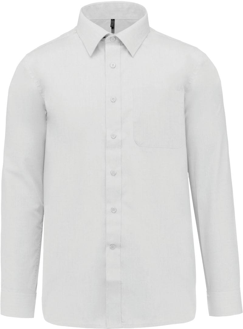 Stäbchenverstärkter Kragen, abgeschrägte Manschetten, abgerundeter Saum, Knöpfe Ton-in-Ton, 2 Ersatzknöpfe, Brusttasche, Rückenpasse mit 2 seitlich gelegten Falten, 40° waschbar, nicht trocknergeeignet