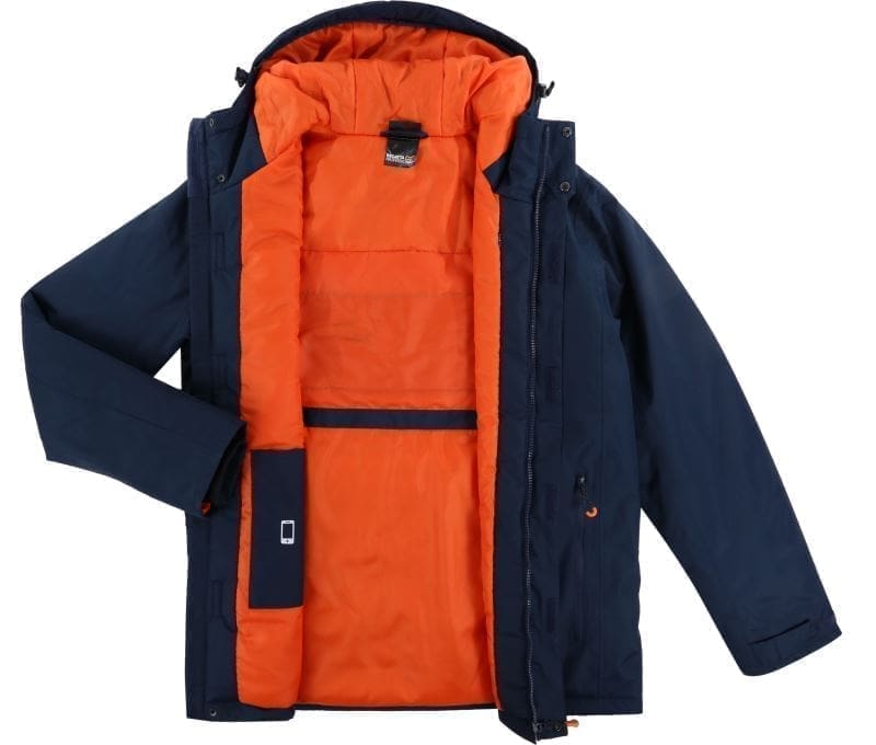 Integriertes batteriebetriebenes Heizsystem mit großem Heizelement am Rücken, Powerbank separat erhältlich (Artikelnummer 36.RBE1), automatische Sicherheitsabschaltung, dauerhaft wasserabweisende Beschichtung, wasserdicht (5.000mm Wassersäule), verstellbare Kapuze mit elastischer Kordel, verstellbare Ärmelbündchen mit Klettverschluss, verstellbarer Saum mit Kordelzug, Powerbank Tasche, Handytasche, 2 Seitentaschen und 1 Brusttasche mit Reißverschluss, Nähte versiegelt, Futter in Kontrastfarbe, 40° waschbar, nicht trocknergeeignet