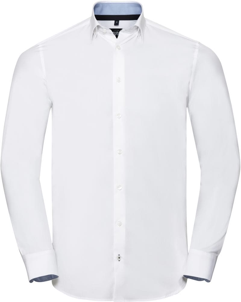 Taillierter Schnitt, längere Passform, Under-Button-Down Kragen, schmale Knopfleiste, abgerundete, mit 2 Knöpfen verstellbare Manschetten, Knopfloch in Kontrastfarbe an Manschette und unterstem Knopfloch, abgerundeter Saum, 2-farbige Kontraste an der Innenseite der Manschetten und an der Krageninnenseite, feuchtigkeitsregulierend, Easy Care, 40° waschbar, trocknergeeignet, keinen Weichspüler verwenden