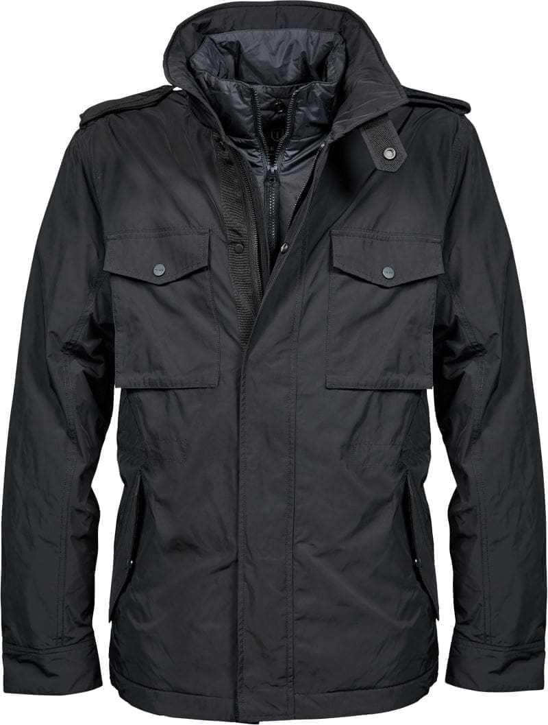 Wasserabweisend, atmungsaktiv (3.000g/m² in 24h), abnehmbarer innenliegender Kragen, geformte Ärmel mit verstellbarem Bündchen, innenliegende Weitenregulierung der Taille, 2 Seitentaschen mit Klappe und Druckknopf, 2 Brusttaschen mit Klappe und schwarzem Metalldruckknopf, Innentasche, Veredelungszugang am Rücken
